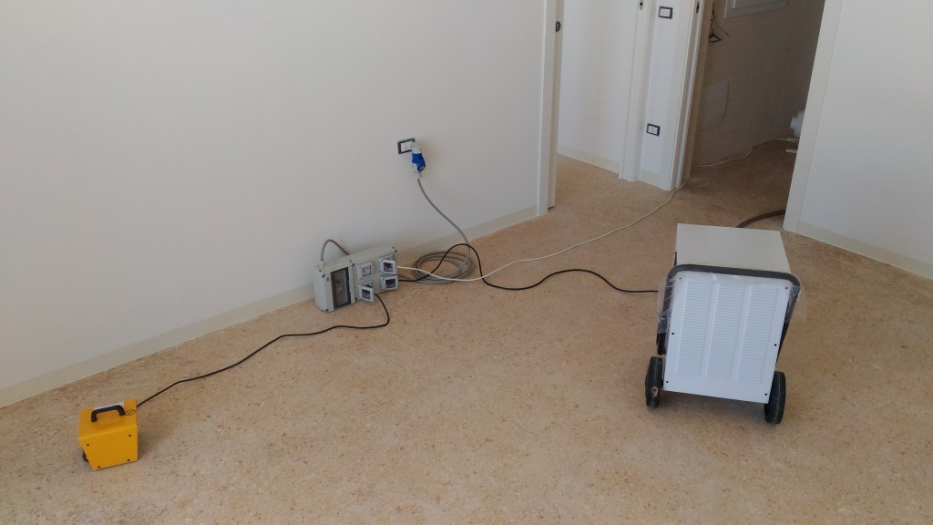 Includiamo tutti i processi strumentali e fisici atti a eliminare o ridurre il quantitativo di umidità presente negli elementi dell’involucro edilizio e nell’ambiente indoor. Implica l’utilizzo di macchine hight performance quali deumidificatori, turbo ventilatori, riscaldatori, posizionati e installati in maniera ponderata e calcolata, all’interno dell’involucro edilizio e ne esistono di diverse tipologie e prestazioni. Per correttezza parleremo quindi di Essiccazione Tecnica o Asciugatura Tecnica, in quanto andiamo ad azzerare il contenuto idrico in eccesso presente nell’elemento.